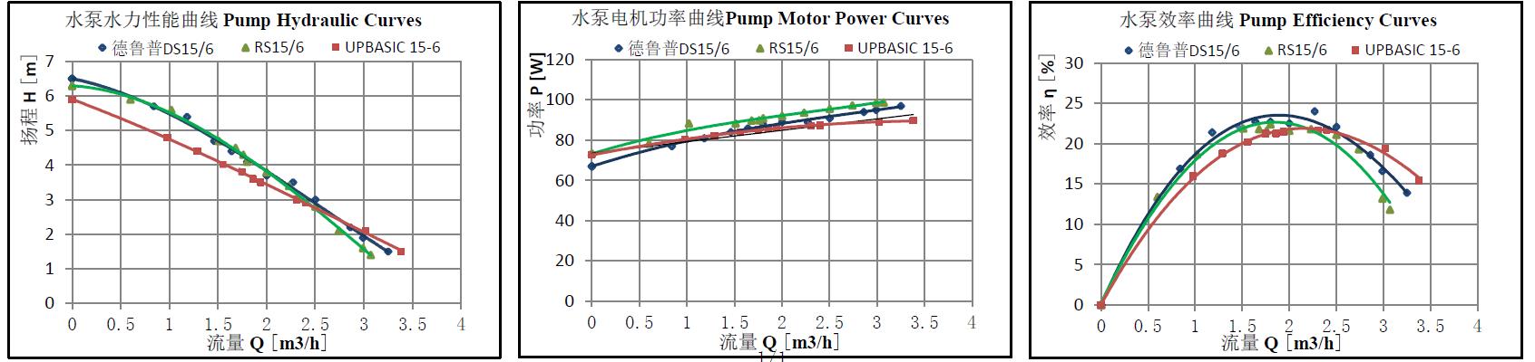 我们选择水泵的型号规格是基于水泵的水力性能曲线,在满足系统流量扬程需求的情况下,水泵效率越高,意味着输入功率越小,电能被有效的转化成了水能,上图是德鲁普DS15/6与竞品的性能对比曲线,规定点流量2m3/h,扬程4m,输入功率仅92W,机组效率达到23.6%,这些数据指标已经达到甚至超越了国际品牌的同类产品,真正体现了中国自主品牌的实力和水平。