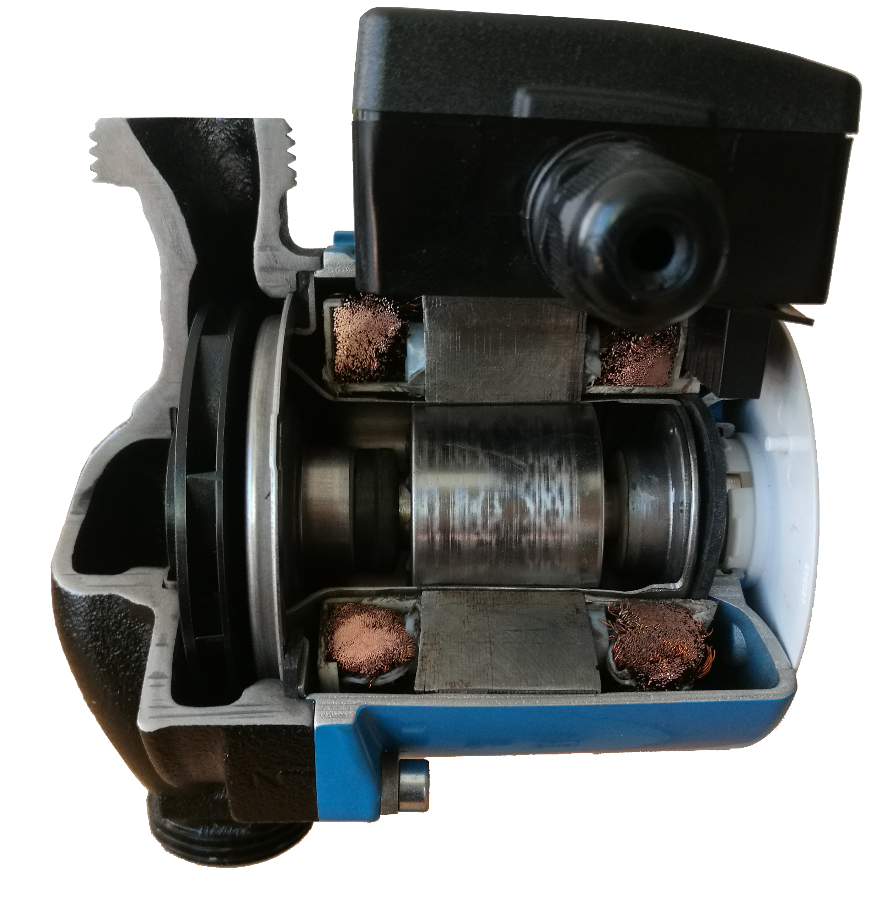 家用暖气循环泵一般采用屏蔽泵结构,即泵和电机连在一起,电动机的转子和泵的叶轮固定在同一根轴上,利用屏蔽套将电机的转子和定子隔开,转子在被输送的介质中运转,其动力通过定子磁场传给转子。屏蔽泵又被称为湿转子水泵,也就是说转子运转时是浸泡在水里的,通过屏蔽套筒与通电的电机定子部分完全隔离。