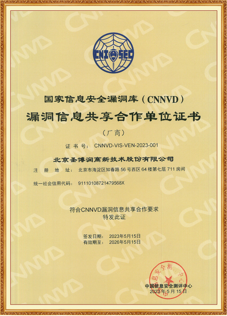 圣博(bo)潤作(zuo)為(wei)CNNVD漏洞(dong)信息(xi)共享合作(zuo)單位,在成立之初便不斷提高重大(da)漏洞(dong)和(he)重要安全(quan)事件的發現、分(fen)析、處置能力(li)。未來,圣博(bo)潤將在信息(xi)安全(quan)漏洞(dong)預警、重大(da)漏洞(dong)信息(xi)通報、漏洞(dong)分(fen)析等方面(mian)與CNNVD展開深度合作(zuo),繼(ji)續履行(xing)維(wei)護網絡安全(quan)的責任和(he)義務,為(wei)國家網絡安全(quan)提供重要技術(shu)支撐(cheng)力(li)量!