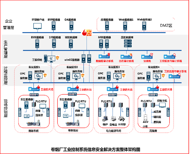 煙草工業企業信息化應用體系建設要遵循自上而下的:工業控制層、生產執行層、管理協同層的三層架構。工業控制系統安全功能應包括身份鑒別、訪問控制、網絡互聯控制、惡意行為防范、安全審計、支撐操作系統安全等措施。